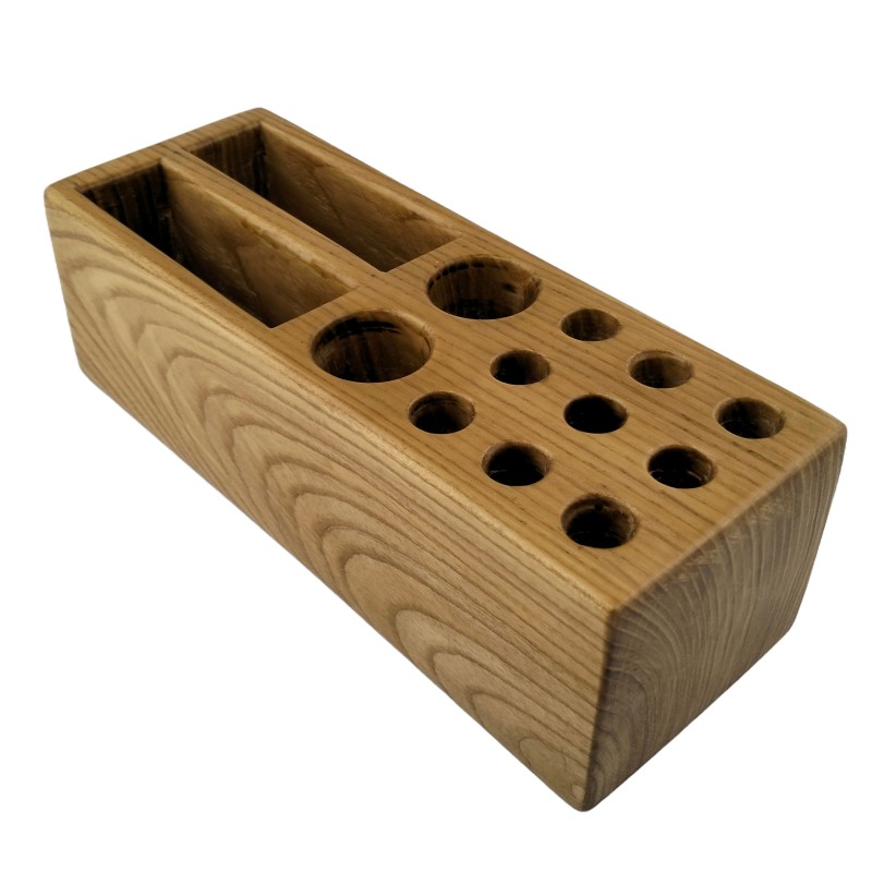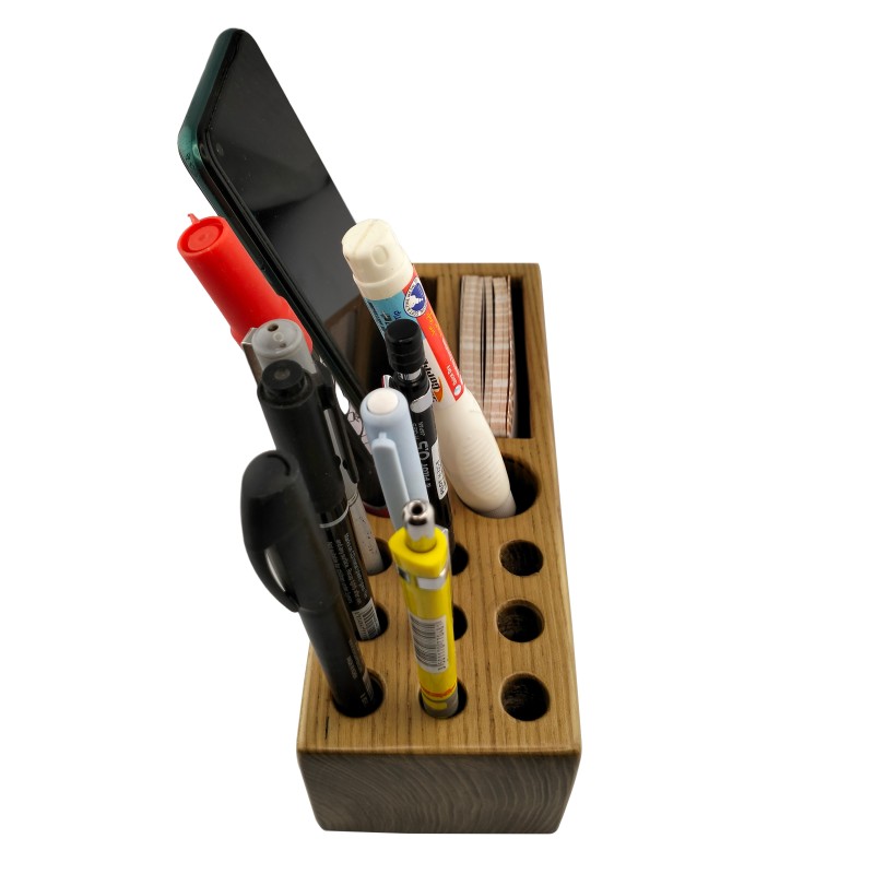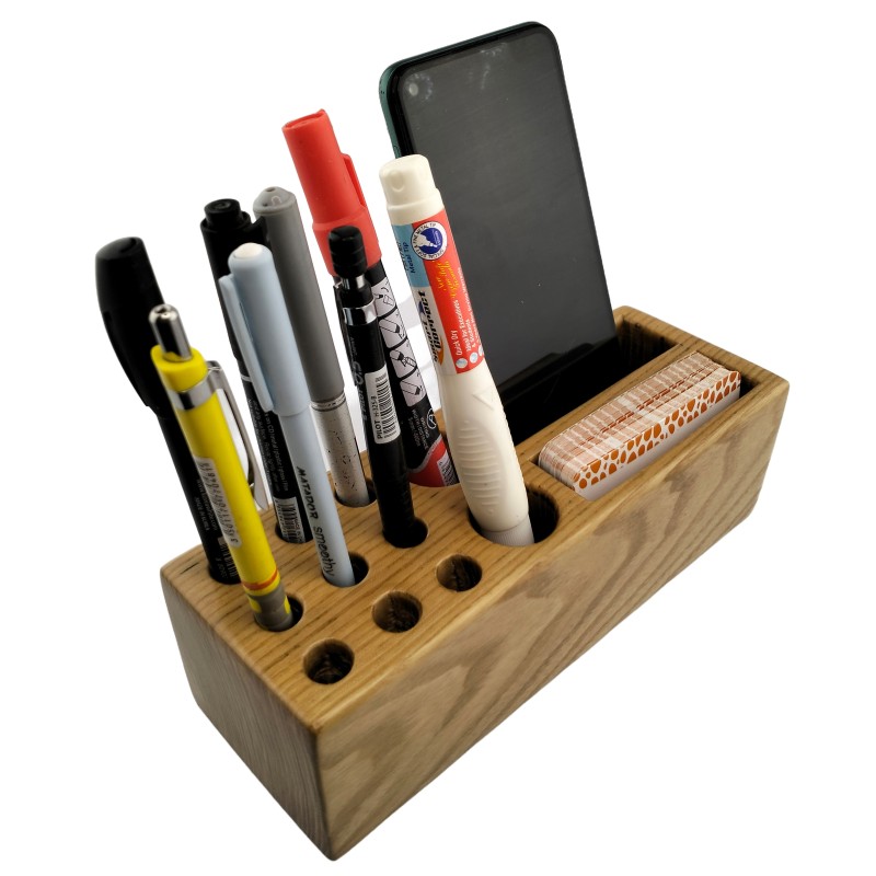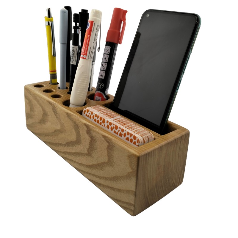 This Wooden Card and Penholder is a masterfully crafted organizer designed to elevate your workspace with both practicality and elegance. This ingeniously designed holder features two distinct compartments, offering seamless storage solutions for your essentials.Securely stow your mobile phone in one section while utilizing the other to store cards, sticky notes, or similar items. Additionally, with nine holes for pens or pencils and two wide slots for markers or other stationery, every tool finds its place effortlessly.Transform your desk into a haven of efficiency and sophistication with this essential accessory, tailored for professionals and creatives alike. Simplify your workflow and enhance your productivity with the Wooden Card and Penholder today.