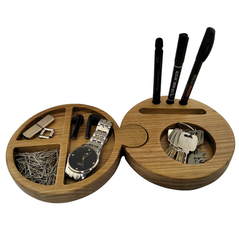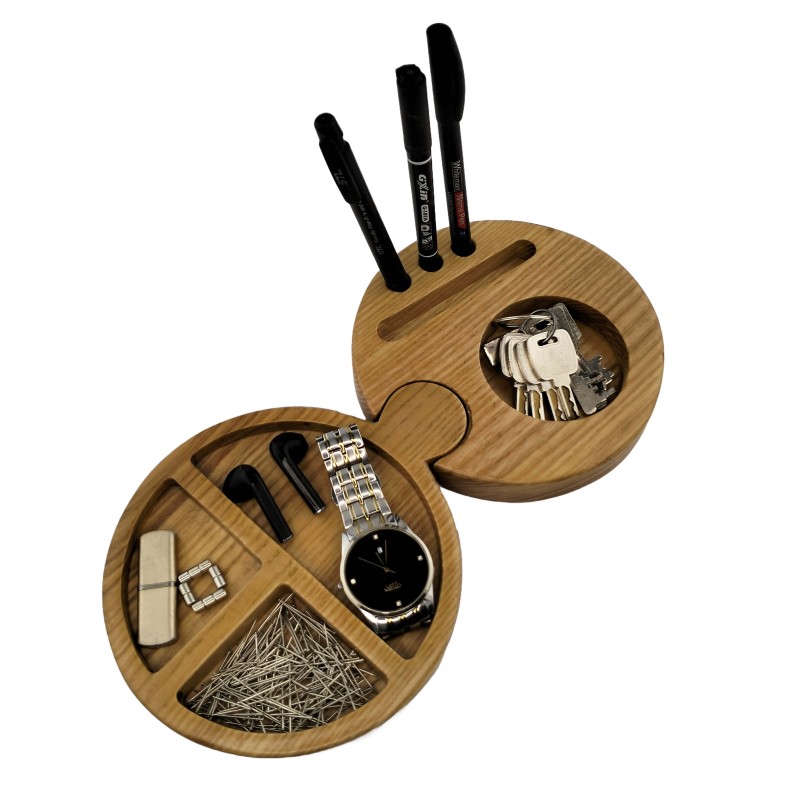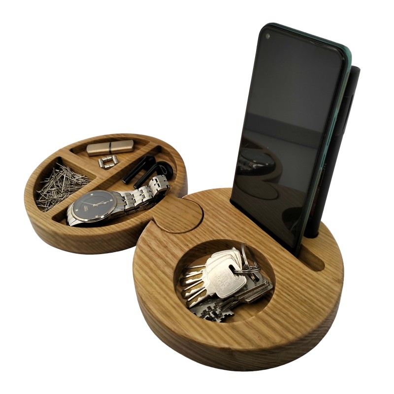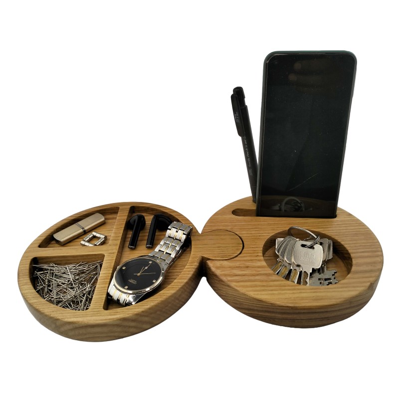 Introducing the Wooden Phone and Keyholder Duo - where style meets functionality in perfect harmony. This innovative design features two paired round sections, each catering to different organizational needs.As Albert Einstein once said, "Out of clutter, find simplicity." Simplify your space with this versatile accessory, offering a designated spot for every essential item.One round holder boasts three compartments for stationery, watches, staplers, or other necessities, while its partner provides a dedicated space for your phone, keys, or similar items. Plus, three holes keep your pens or pencils neatly in place.Elevate your organization game with the Wooden Phone and Keyholder Duo – a must-have for every desk, entryway, or bedside table.