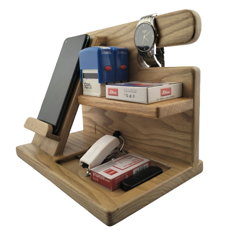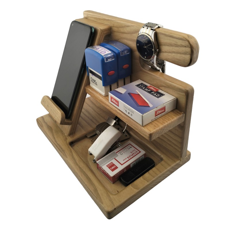 Introducing the Wooden Phone and Watch Organizer – a multifunctional marvel that combines practicality with aesthetic appeal. Featuring a dedicated slot for your phone and a sleek watch stand, this organizer keeps your essentials within reach while adding a touch of elegance to your space.But that's not all – with two layered holders, it's perfect for storing stamps, notepads, stationery, or similar items, keeping your desk tidy and organized.More than just an organizer, it's a statement piece that doubles as a work of art. Ideal for gifting to those who appreciate both functionality and beauty, it's the perfect way to elevate any workspace or home decor.